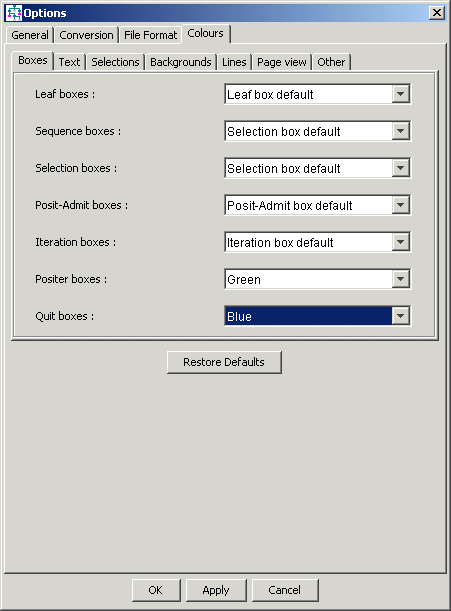 Colours are chosen using drop-down lists. The colours available in these lists are all the defaults used by the Structure Editor (e.g. 'Leaf box default', 'Iteration box default' ...) plus a selection of other named colours (e.g. 'Red', 'Yellow', 'Orange', 'Green' ...)