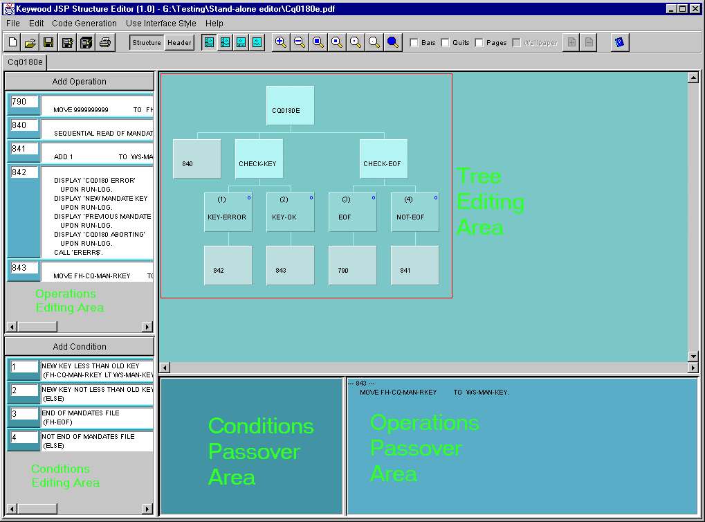 There are three 'editing areas' and two 'passover areas'. The editing areas are, as one might expect, where the tree structure, its operations and conditions can be edited. The passover areas are used to display information as the mouse passes over objects in the tree editing area. If the mouse passes over a box with a condition, the text of that condition is displayed in the conditions passover area. If the mouse passes over a box that contains operations, the text of all those operations is displayed in the operations passover area.