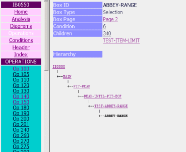 The documentation is presented in a twin-frame form comprising of a number of collapsible indices. Full use of hypertext links is made to allow unparalleled navigation through the structure, its operations and conditions. Each box in the structure is shown with its ancestor and child boxes, and any associated operations or conditions.